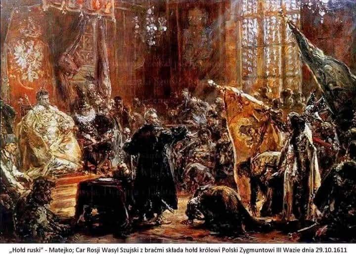 414 lat temu, 29.10.1611 r. car Rosji Wasyl IV Szujski ukorzył się i złożył pokłon przed Majestatem Rzeczpospolitej. Car klękając, bijąc czołem i całując królewską dłoń oddał Hołd siedzącemu na tronie królowi 🇵🇱 Zygmuntowi III Wazie❗Wraz z nim Hołd Polskiemu Królowi oddali dwaj carscy bracia: Dymitr Szujski, naczelny wódz moskiewskiej armii i Iwan Szujski, następca tronu. Hołd oddany został w Warszawie, po zwycięskiej wojnie i zajęciu Moskwy przez wojska Rzeczpospolitej pod dowództwem hetmana Stanisława Żółkiewskiego.Pamięć, Cześć i Chwała 🇵🇱 Bohaterom. Chwała Wielkiej Polsce❗